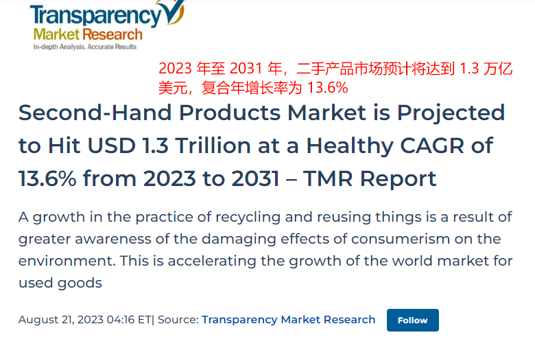 全球规模预测惊人:Transparency Market Research的研究数据指出,全球二手转售市场规模预计将在2023年至2031年间持续扩张,最终达到惊人的1.3万亿美元。在此期间,其复合年增长率预计将高达13.6%,展现出巨大的发展潜力。