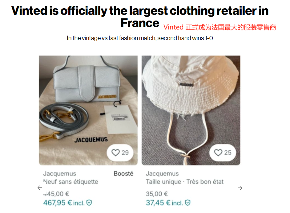 法国市场热度高涨:法国市场的转售业务同样火热。IFM的报告显示,今年第一季度,二手服装在法国的销量占比已达到10.9%。年轻人是主力军,贡献了高达16.3%的市场份额。值得注意的是,平台Vinted在今年第一季度的服装销量已超越电商巨头亚马逊和本土全渠道零售商Kiabi,跃居法国第一。