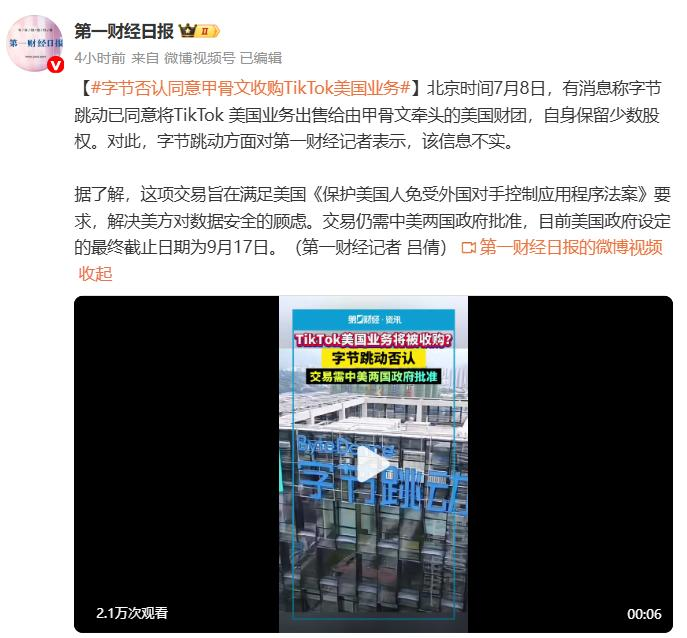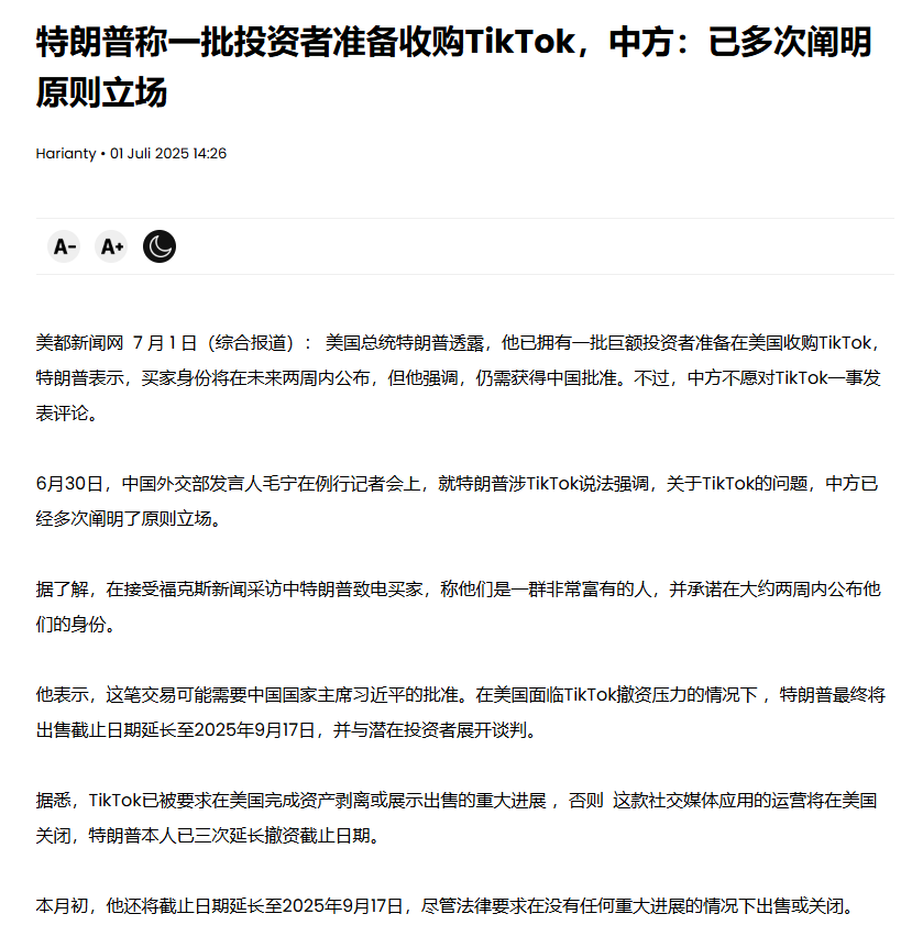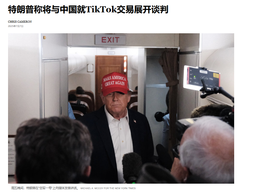 这一否认直接针对的是近日再度升温的“TikTok美国剥离传闻”。据《纽约时报》报道,美国前总统特朗普在7月4日对外表示,TikTok美国业务“基本已经达成了出售协议”,而他本人将在7日或8日与中方进行磋商。特朗普还补充称,这笔交易若要最终落地,仍需获得中国方面的批准。