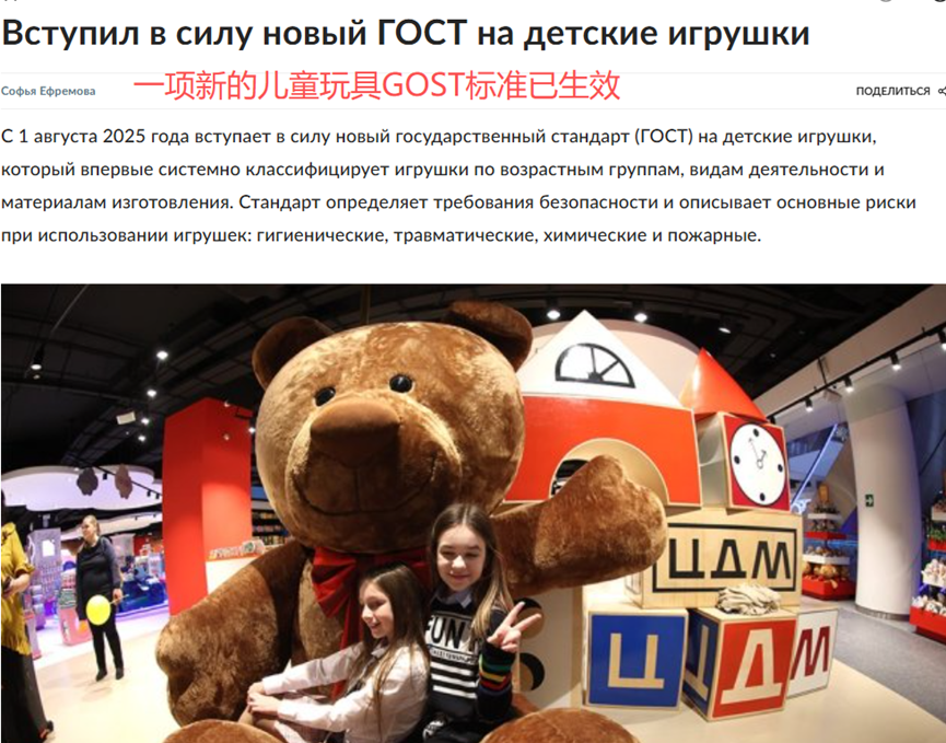 与此同时,俄罗斯自今年8月起也开始强制执行新版玩具国标,要求所有玩具必须附俄语及欧亚经济联盟官方语言标签,并完成EAC认证。高风险品类还需送交联盟境内实验室检测,并取得合格证书。