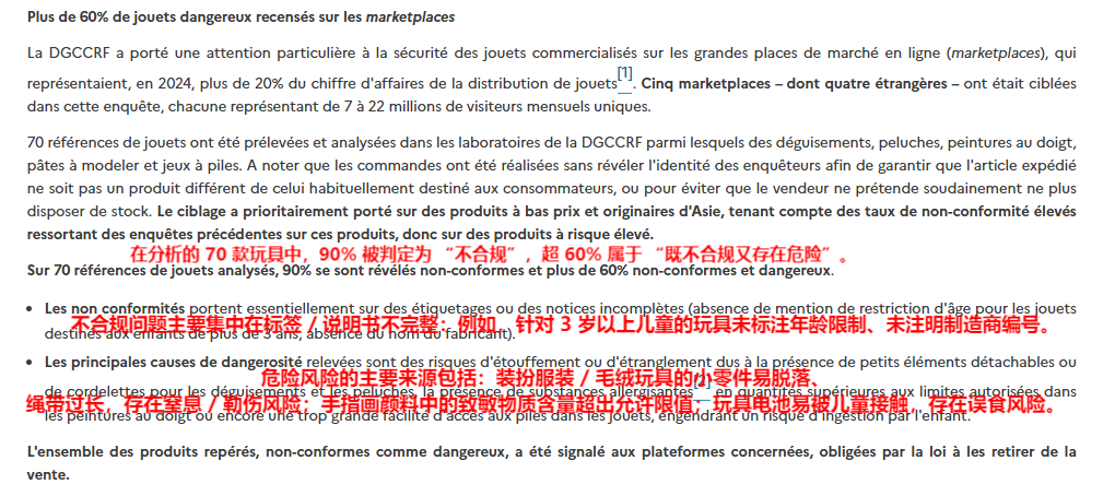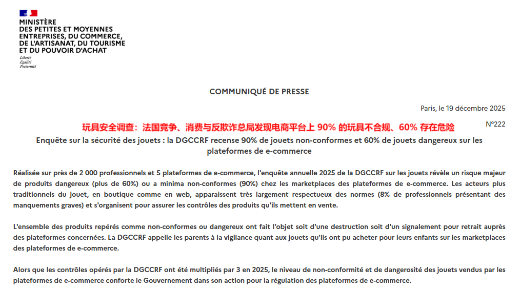 法国竞争、消费与反欺诈总局(DGCCRF)在其2025年度玩具安全调查中,将矛头直指线上销售渠道,结果触目惊心——抽查的线上玩具中,高达90%存在不合规问题,超过60%的产品甚至暗藏直接安全风险。