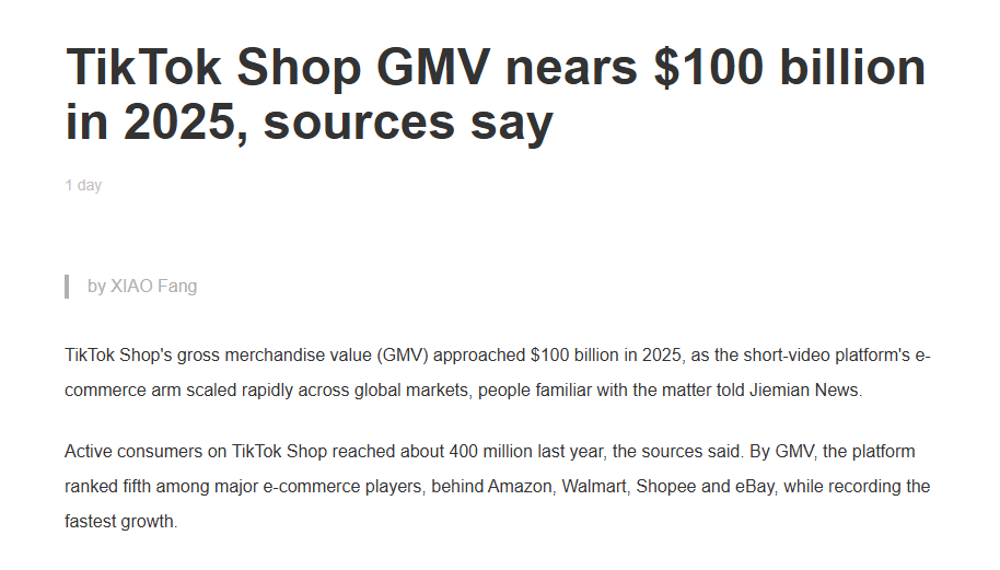 最新数据显示,2025年其活跃买家数已突破4亿,全年交易总额逼近千亿美元,成功跻身全球电商前五,仅次于亚马逊、沃尔玛、Shopee和eBay。
