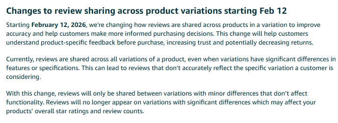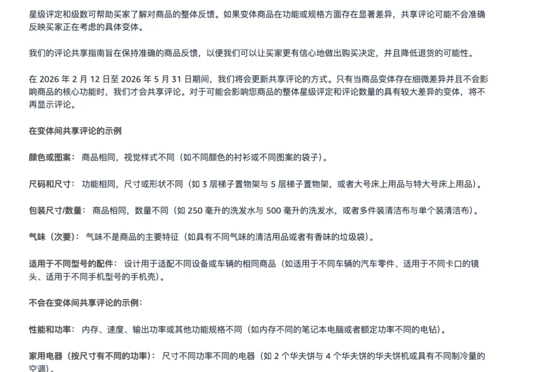 近日,亚马逊宣布一项重磅政策调整:自2026年2月12日起至5月31日,将分阶段实施变体商品评论共享规则改革。