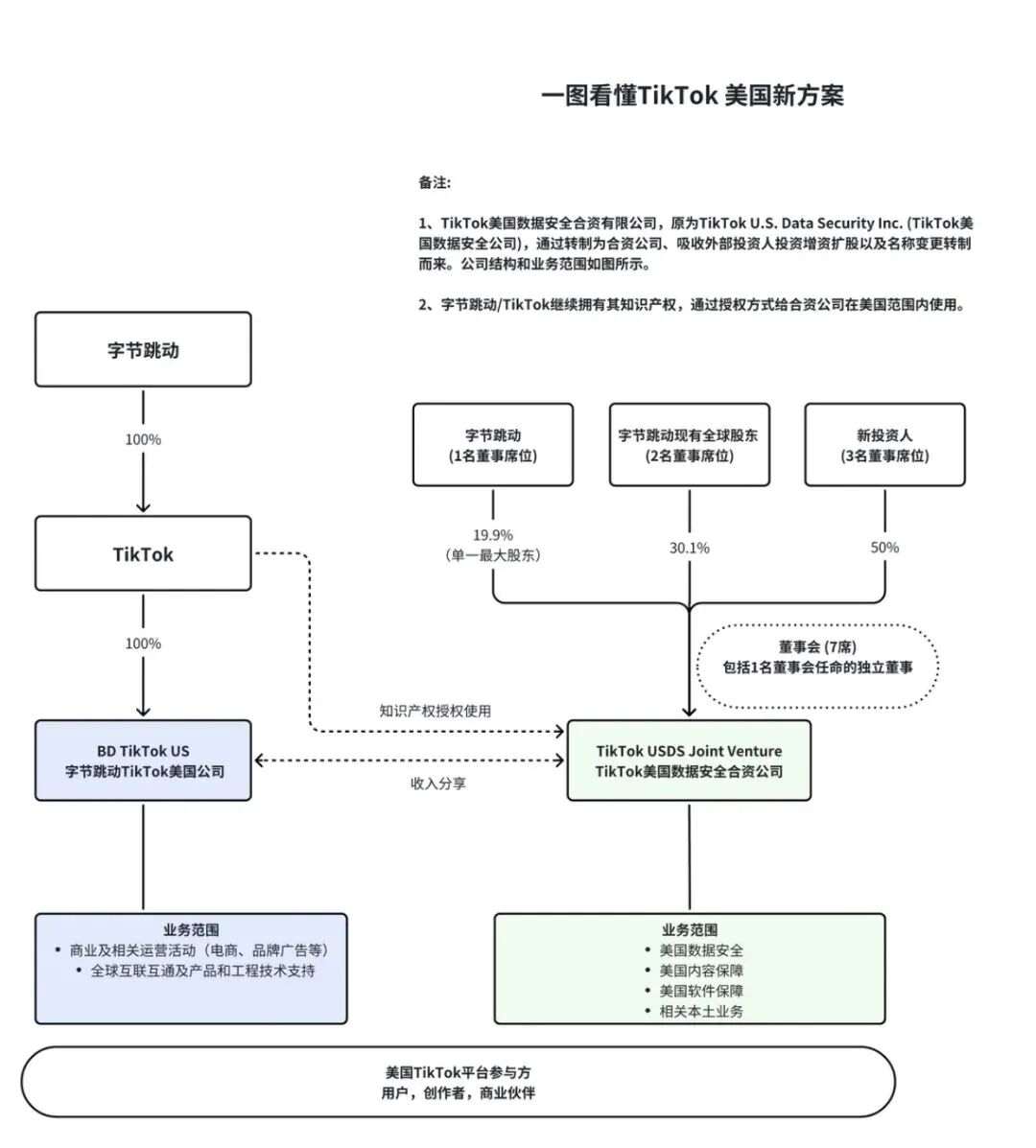 此次重组方案明确了TikTok美国地区的新运营格局。根据官方文件,全新的TikTok USDS公司将主要负责: