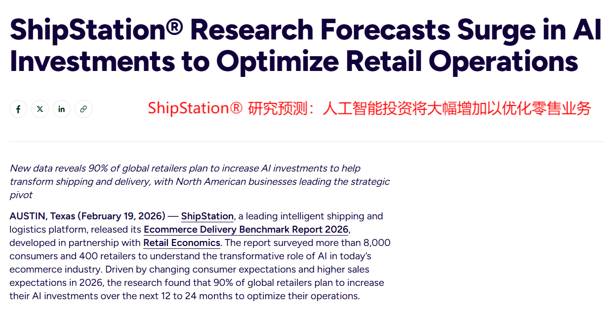 近日,ShipStation联合Retail Economics发布了《2026年电子商务配送基准报告》,其中披露的一系列数据值得行业关注。数据显示,高达90%的全球零售商都计划在未来12到24个月内,往人工智能这个“篮子”里猛砸钱,目的只有一个——用技术把物流的每个环节都优化到极致。
