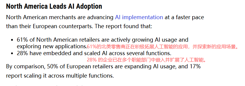不过,虽然大家都在跑步进场,但起跑速度还是差了不少。大西洋两岸的画风就截然不同:北美地区的零售商明显冲得更猛,有61%的企业正在积极拓展AI的应用场景,其中28%的“尖子生”已经把AI深度融入了多个职能部门,玩起了规模化。