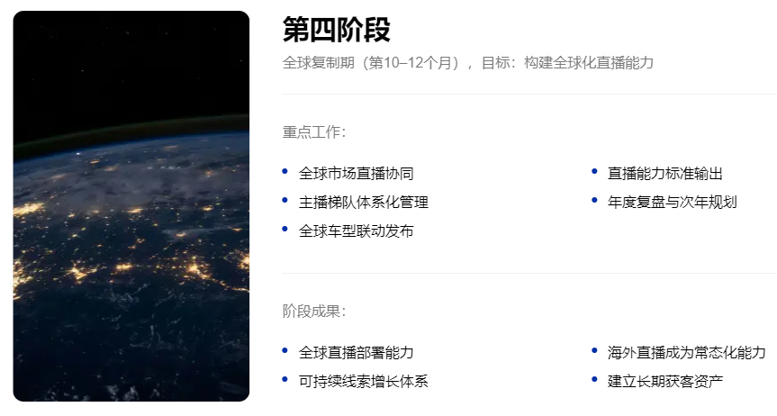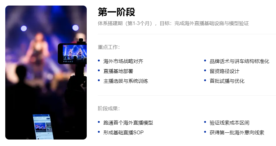 帮品牌跑通第一个海外直播模型,验证线索成本区间,拿到第一批意向线索。这个阶段重点是搭基础设施、培训主播、试播优化。