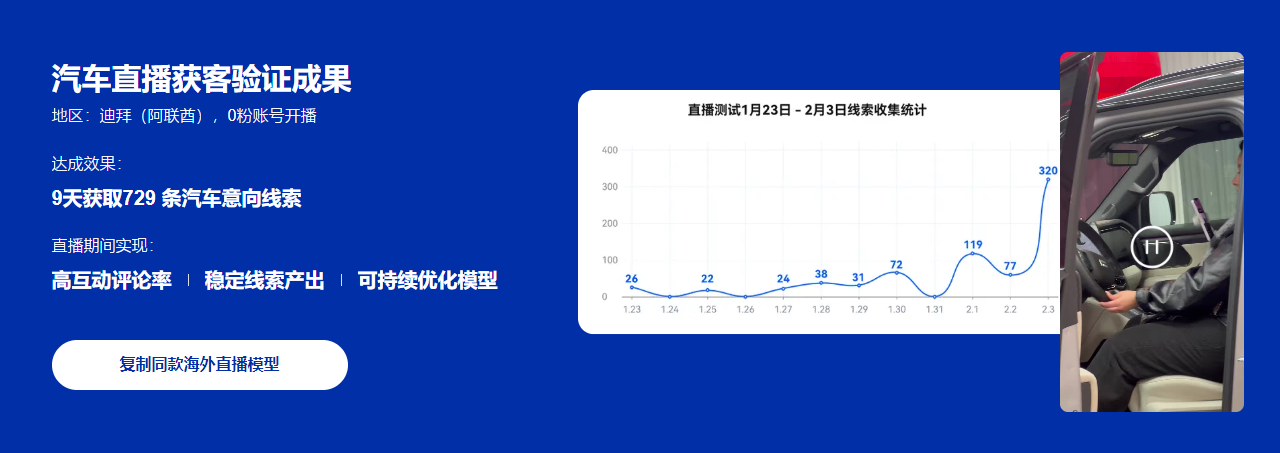 那个9天729条线索的案例,不是偶然。我们把国内已经跑通的直播卖车逻辑,适配到海外市场,发现效果比预想的还要好。