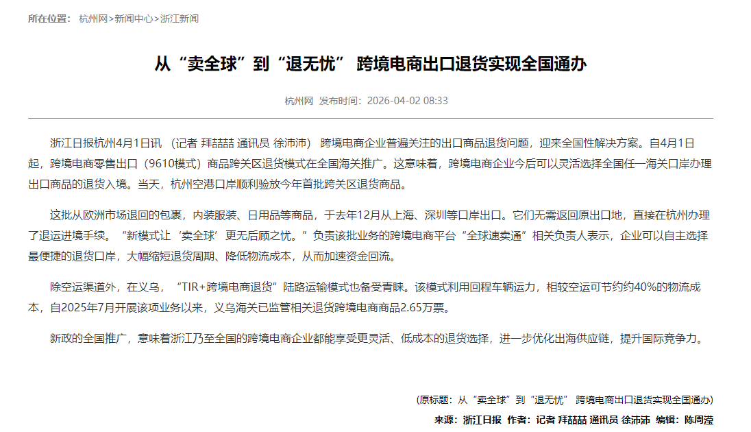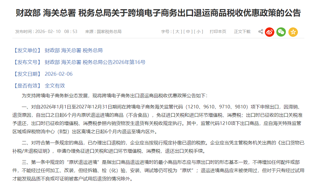 今年2月三部门联合发布的税收优惠政策规定:在2026年1月1日至2027年12月31日期间,跨境电商出口的商品如果因为滞销或退货原因,在6个月内原状退运回国内(食品除外),不仅免征进口关税和进口环节的增值税、消费税,连之前已经缴纳的出口关税也可以申请退还。