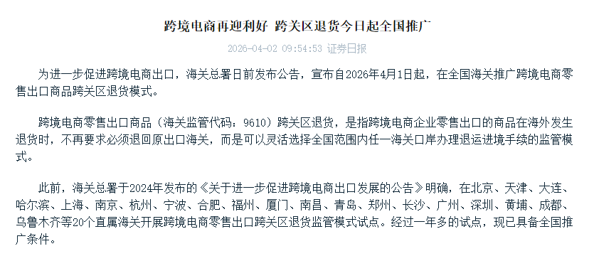 从4月1日起,跨境电商行业迎来历史性变革——海关总署正式在全国海关全面推广跨境电商零售出口商品跨关区退货模式!