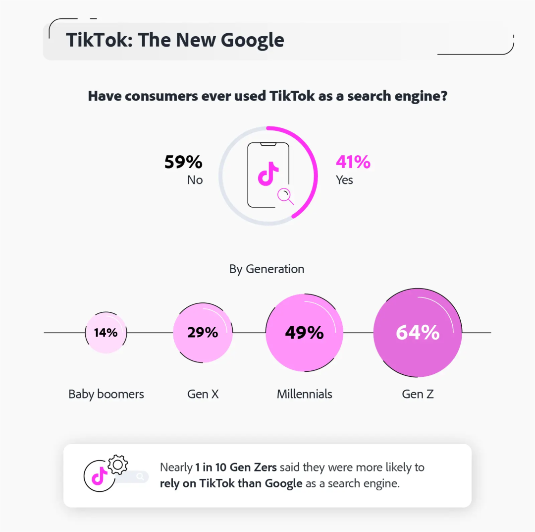 跨国软件公司Adobe此前曾揭示过一项数据,他们在研究美国人的搜索习惯时发现,有超过五分之二的美国人已经将TikTok作为首选搜索引擎。