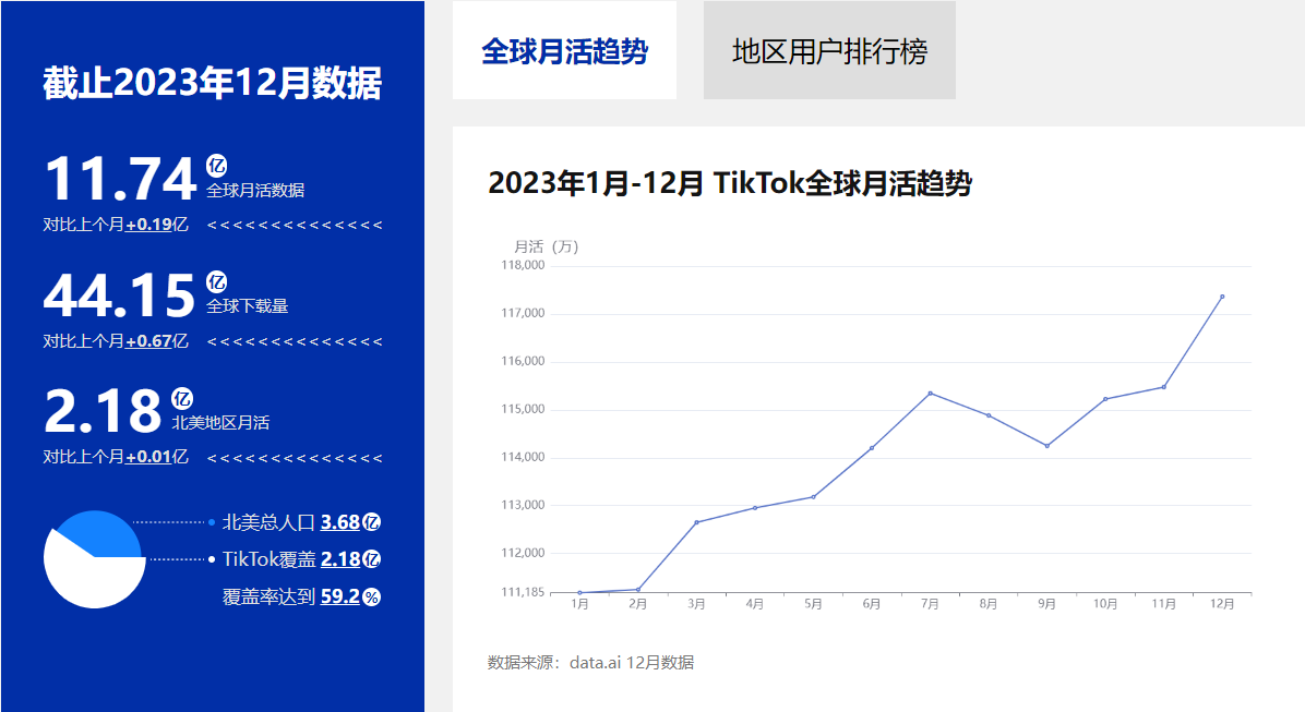 TikTok是全球用户数量排行前列的社交媒体平台,截至2023年底,其在全球已经拥有超过16.77亿用户,月活量更是达到了11.74亿,其中北美月活量就有2.18亿,是TikTok 最大的市场之一。
