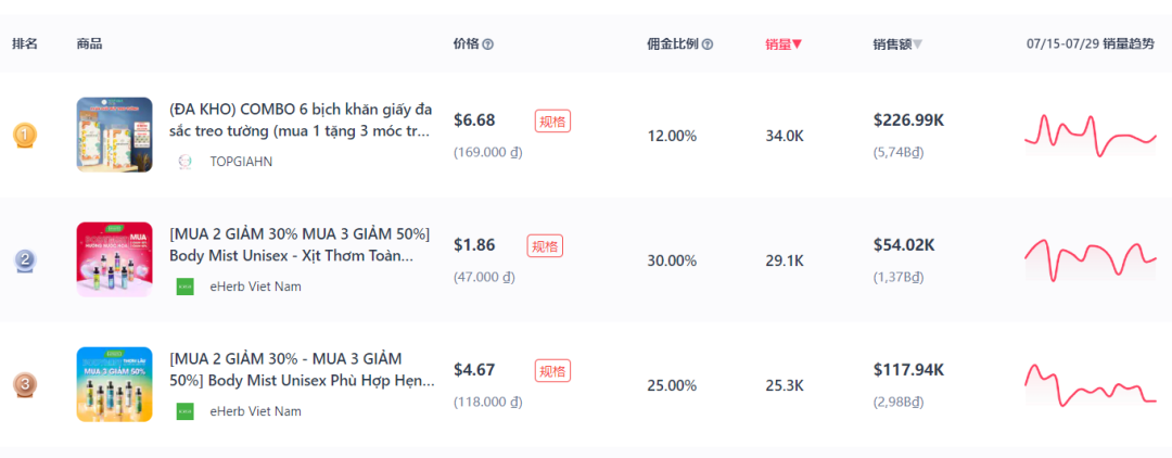 与此同时,TikTok在越南市场中表现抢眼。来自eHerb Viet Nam店铺的一款香水喷雾本周登上畅销榜前3,累计周销量达到5.4万单,销售额超过17.1万美元。越南地处热带,夏季高温多湿,消费者对清新持久的香水需求旺盛,这也是该品类近期销量大涨的重要原因。